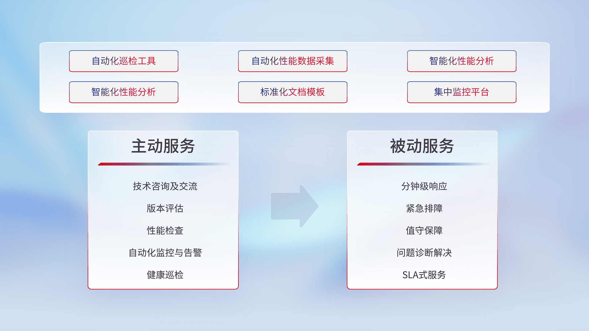 智能化工具和标准化文档,,,,保障服务质量,,提供主动服务(包含技术咨询、、、、版本评估、、、、性能检查、、、自动化监控与告警、、健康巡检)和被动服务包含(分钟级响应、、、、紧急排障、、值守保障、、问题诊断解决、、、、SLA服务)。。。。