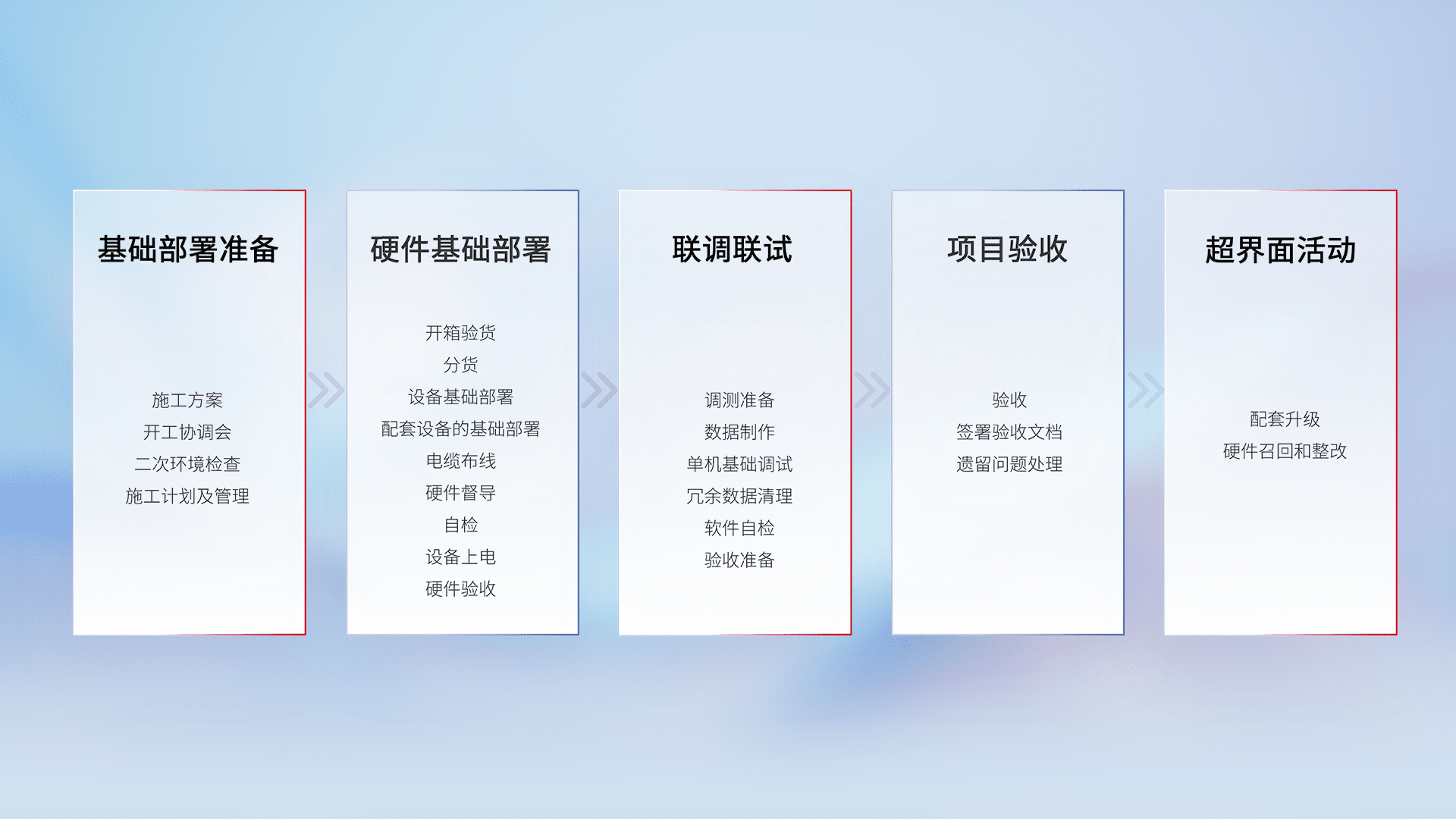 从基础部署准备、、硬件基础部署、、、联调联试、、、项目验收、、、、越界面活动的全过程可追溯,,,保证施工质量和进度。。。